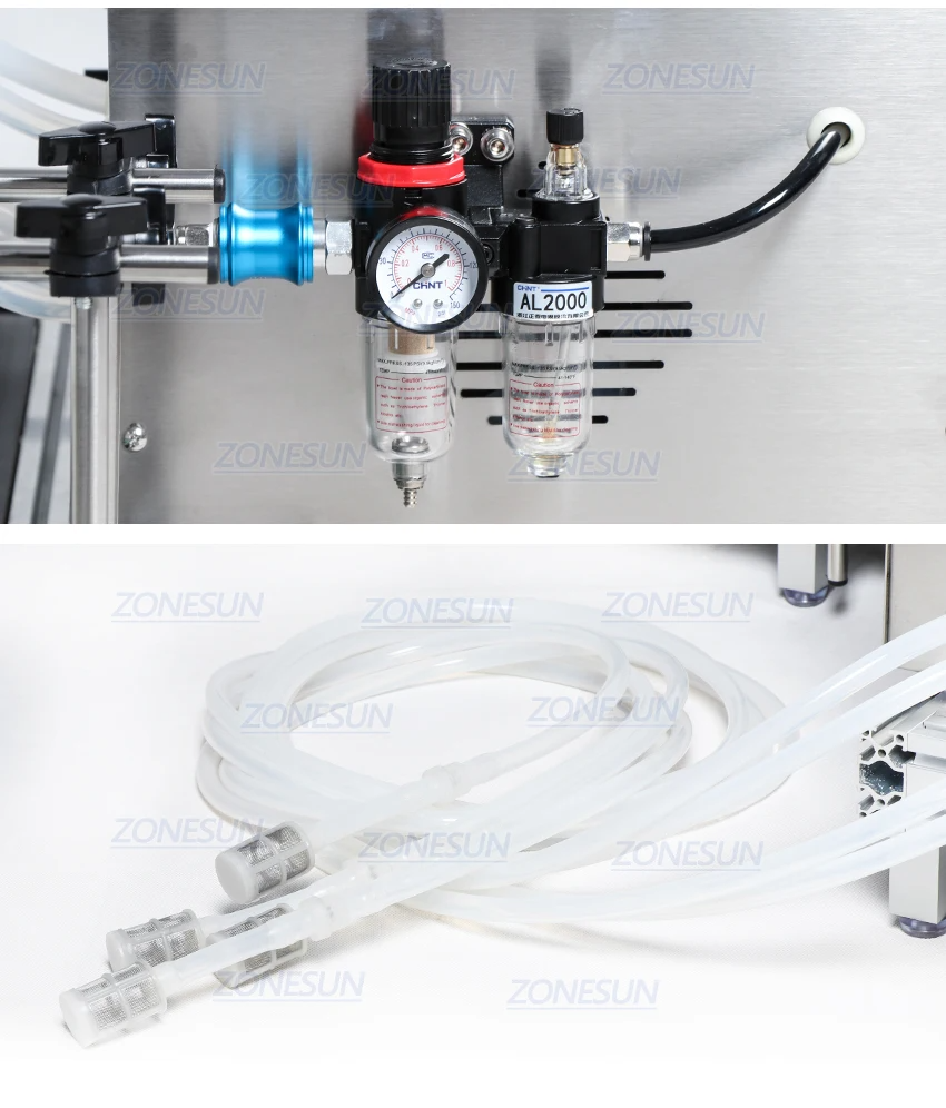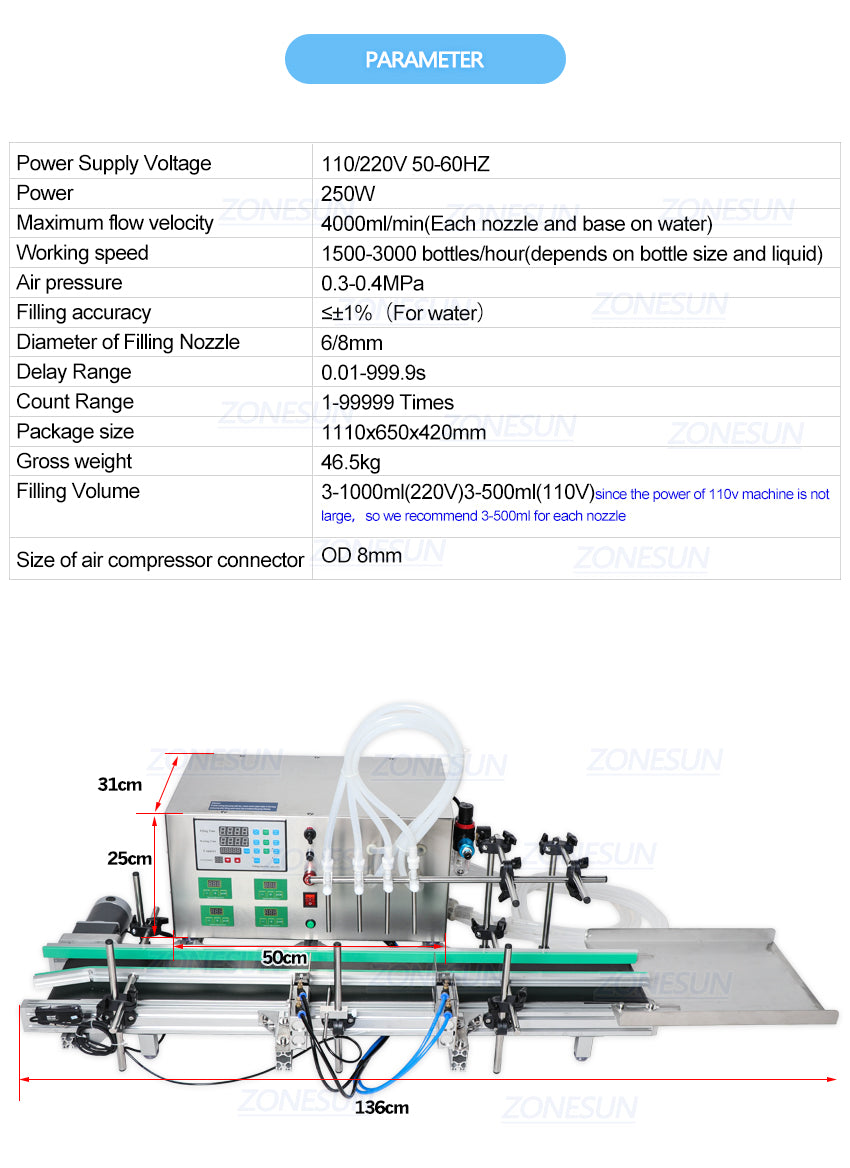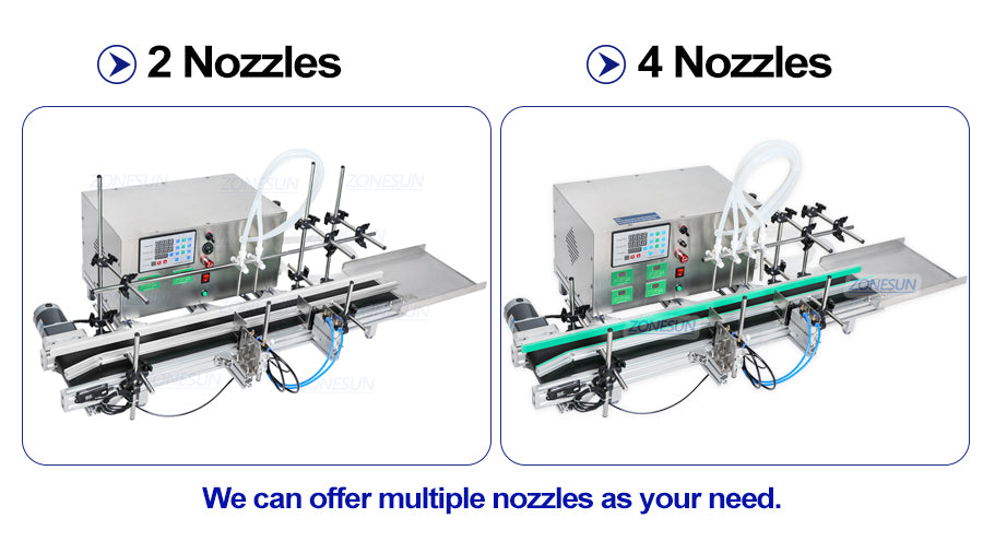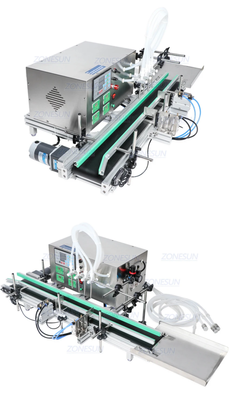 เครื่องนี้มีสายพานลำเลียงและมีฟังก์ชันที่คล้ายคลึงกับเครื่องบรรจุอัตโนมัติเต็มรูปแบบ นอกจากนี้ยังมีหัวฉีดหลายหัว และลูกค้าสามารถควบคุมหัวฉีดแต่ละหัวได้